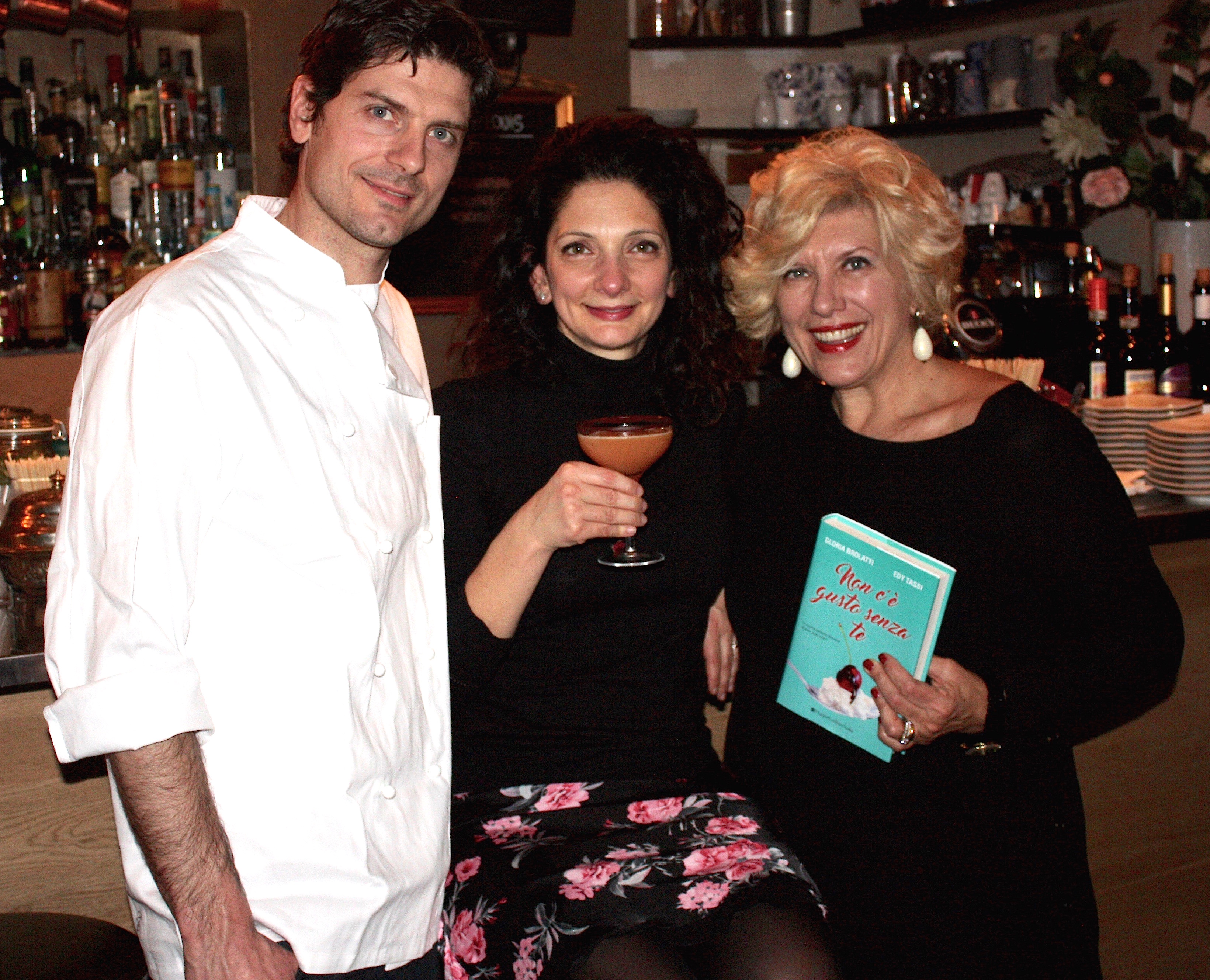Gloria Brolatti e Edy Tassi, autrici di Non c'è gusto senza te, con Giorgio G., il modello che ieri sera sui Navigli, al lancio dell'omonimo cocktail, ha interpretato per il pubblico presente il ruolo di Massimiliano Vialardi, lo chef protagonista del romanzo, che è in libreria per HarperCollins editore.